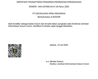 PT Digitalisasi SPBU Indonesia was founded and formally ratified as a legal entity in the form of a Limited Liability Company (Perseroan Terbatas) on the 18th, as officially recognized by the Ministry of Law and Human Rights of the Republic of Indonesia.